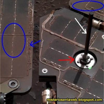 Lo mas extraño, es que en algunas instantáneas que el Spirit ha enviado, se aprecia como la limpieza de los paneles y su tornillería ha sido efectuada manualmente, el brillante metal de los tornillos y los paneles parecen ser limpiados selectivamente, es como si empezasen en una zona y terminasen en otra, algo que solo puede deberse a la mano humana (¿humana?) como se aprecia en las fotos inferiores, asimismo, las zonas “vitales” para su funcionamiento están relucientes y limpias, por contra las zonas “no vitales” aparecen llenas de polvo marciano.